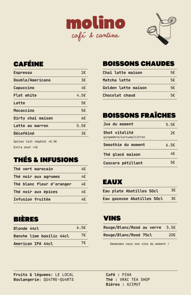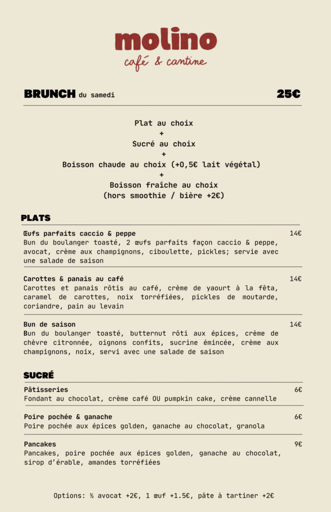 Menu Au Molino, découvrez une cuisine généreuse et 1OO% faite maison, avec des produits frais et de saison. Notre carte évolue au fil des mois et de nos envies !Sur place ou à emporter / Réservation conseillée le midi